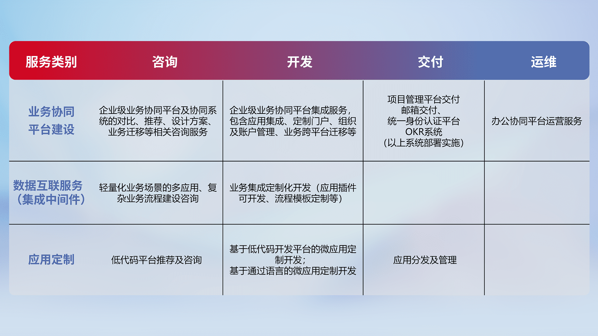 针对钉钉、、、企微、、、IDaas等平台级产品提供产品的规划、、方案、、、交付、、、、定制化开发等服务,,,实现如统一协同办公、、、、智能客户服务、、混合会议管理、、、智能数据查询、、、、等业务场景,,,实现数字化转型。。。。